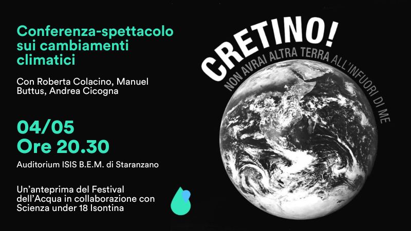 Sabato 4 maggio, alle 20.30, l’Auditorium dell’ISIS B.E.M. di Staranzano apre le porte a studenti, docenti, famiglie, amici di tutte le età per assistere alla conferenza-spettacolo sui cambiamenti climatici Cretino! Non avrai altra Terra all’infuori di me (ingresso libero).
